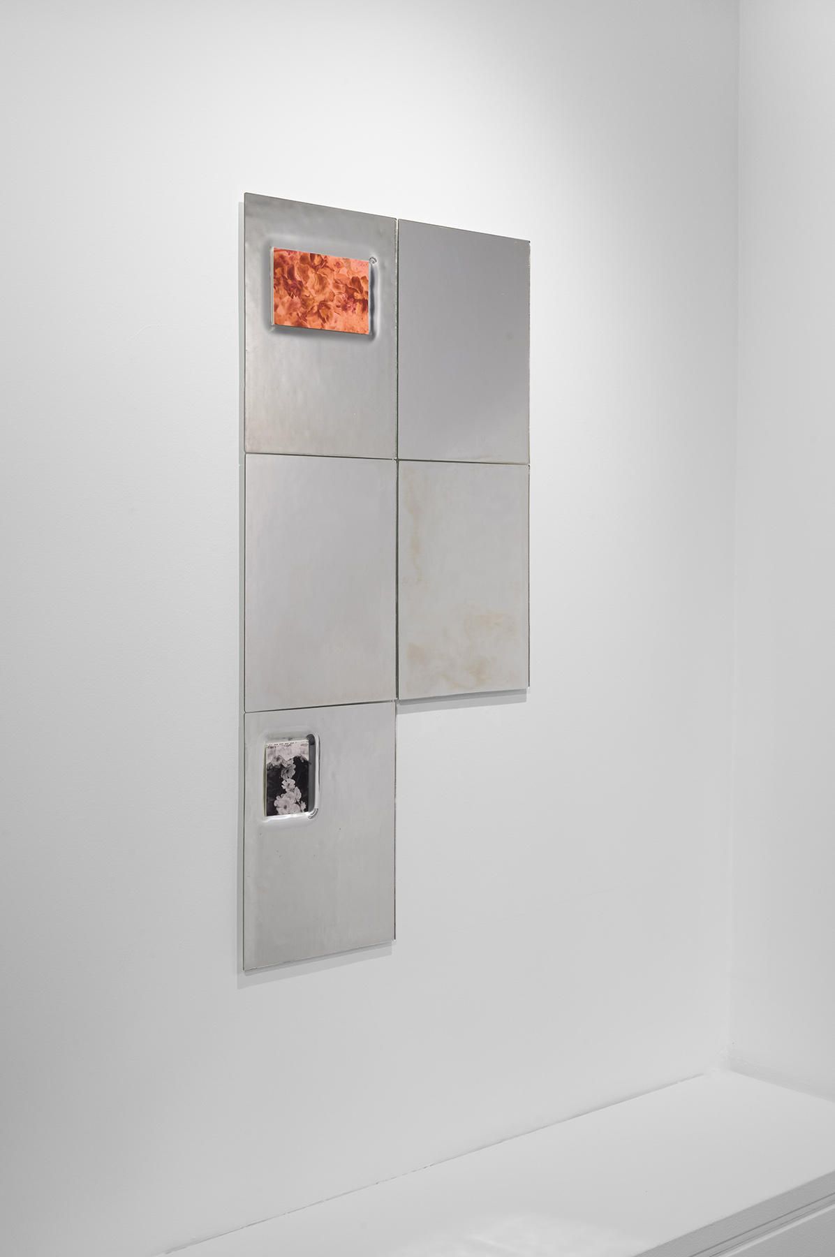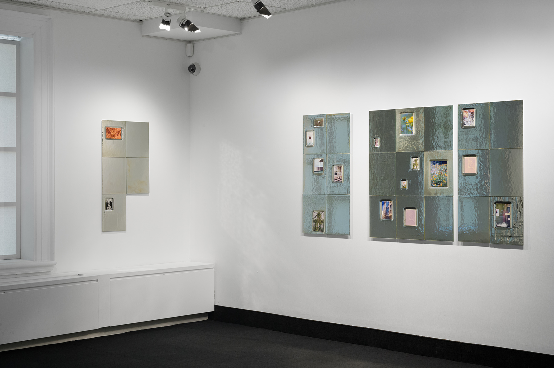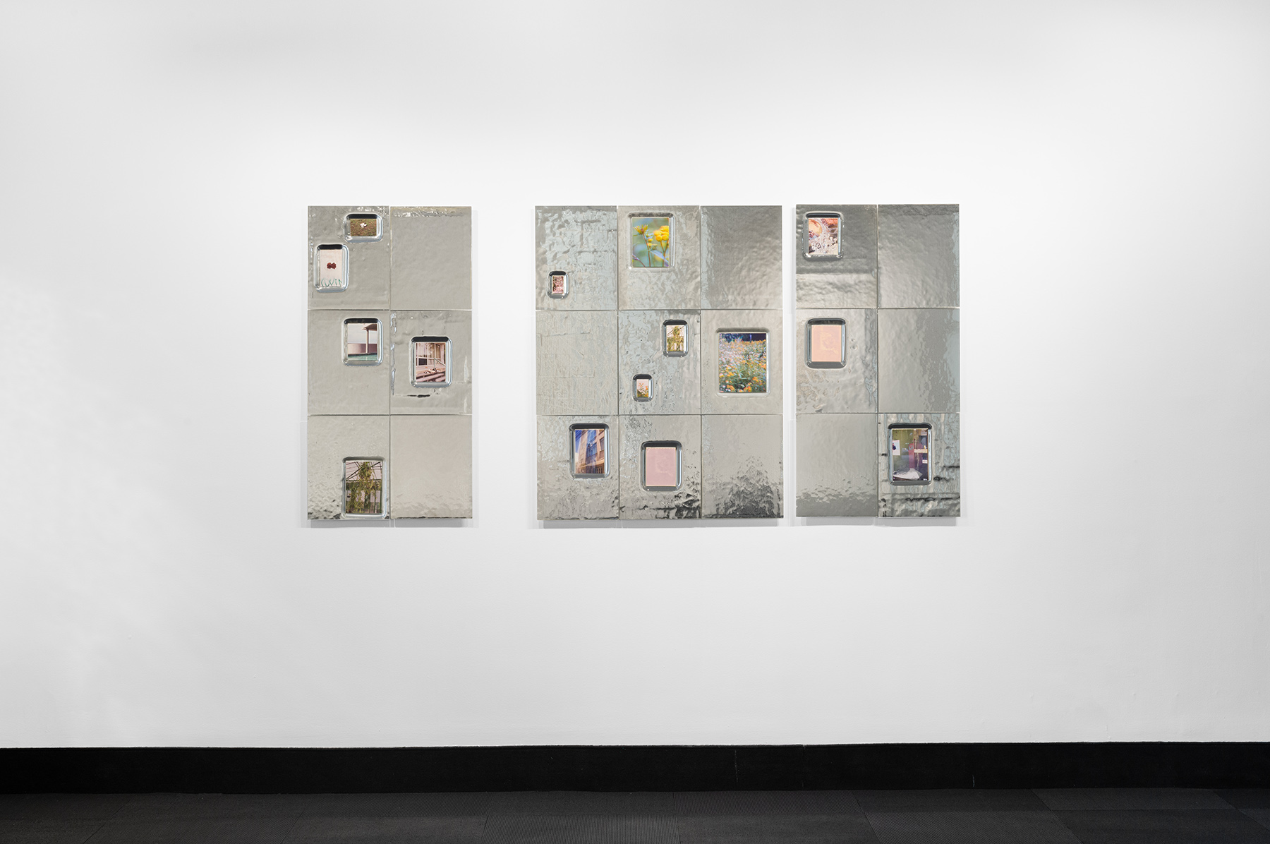 Inspired by Georges Perec's book An Attempt at Exhausting a Place in Paris, which brings together a collection of observations describing all the little things in life that usually go unnoticed, the photographic series An Attempt at Exhausting a Place reveals what at first glance seemed unworthy of attention. Lorna Bauer draws on her personal archive to revisit images taken over the last twenty years, highlighting the mundane details, ordinary events, and subtle phenomena that cause the world around us to fluctuate. The photographs are inserted into glass tiles shaped by the artist, onto which she has carefully applied silver nitrate—a chemical substance that reveals the photographic image. Between image and object, each work presents itself as a fragment of an infinite whole, cataloguing the minute variations of time, light, setting, and life. Reflections of the surrounding reality combine with the shimmering effect of silver nitrate and photographs from the artist's archives to create complex, prismatic representations of life.