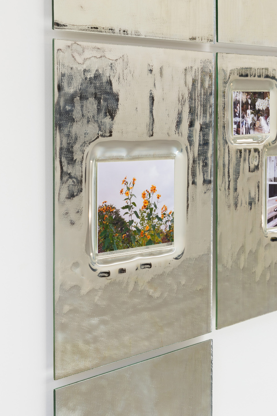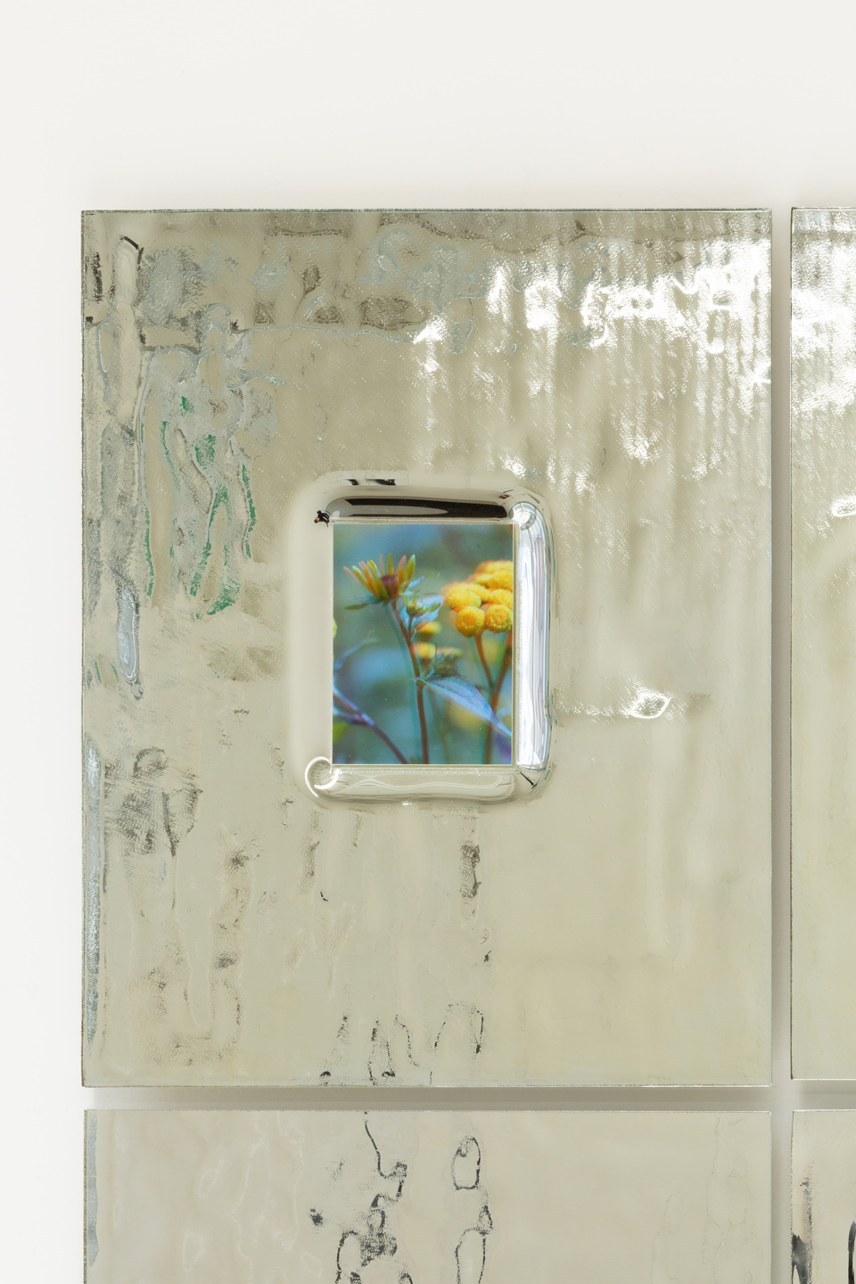 The exhibition Sunday is Violet loosely connects three photographic ensembles that together manifest Bauer’s rigorous and fervent love for the processual. White roses softly cascading against a veil of chemicals, are made apparent by using expired black-and-white polaroid film. A bee is captured swooning in the corolla of a delicate Japanese anemone, barely trembled by the wind during long exposures. Alongside these are pocket-size snapshots inlaid into dazzling hand-mirrored glass panels. These are delightful, mundane visions encountered in gardens—familiar sites in Bauer’s work—although they could have been shot anywhere, far or near. What matters here is the embodied act and labour of crafting an image.