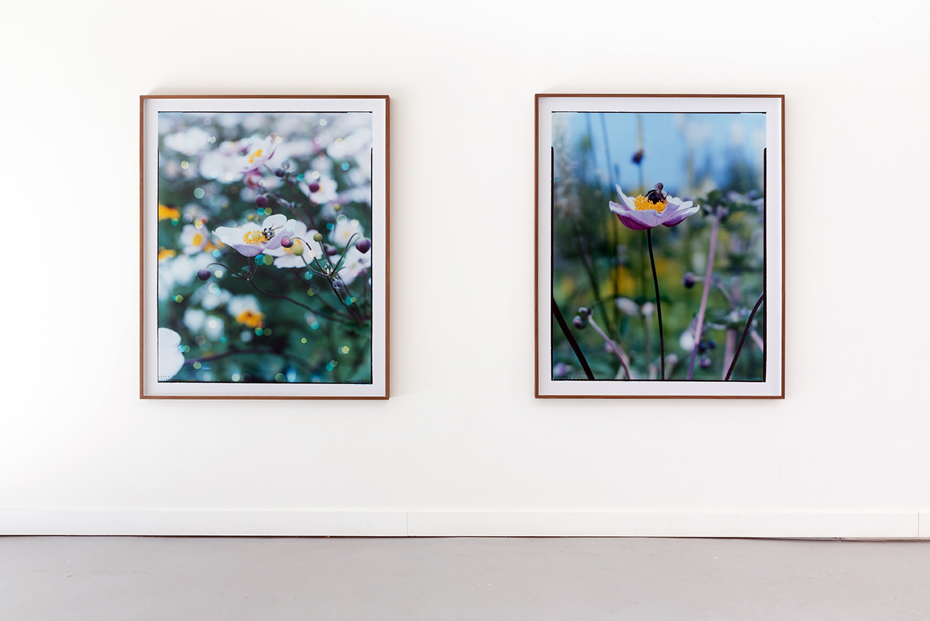 Pourtant, la fleur insiste. Elle est vue de près, comme si l'objectif de l'appareil photo allait toucher ses pétales. Elle est agrandie à l'échelle d’un corps humain et le procédé argentique en couleur lui donne une profondeur et une prestance exceptionnelles. La voilà devenue une architecture à part entière, un refuge pour l'abeille comme pour notre regard.