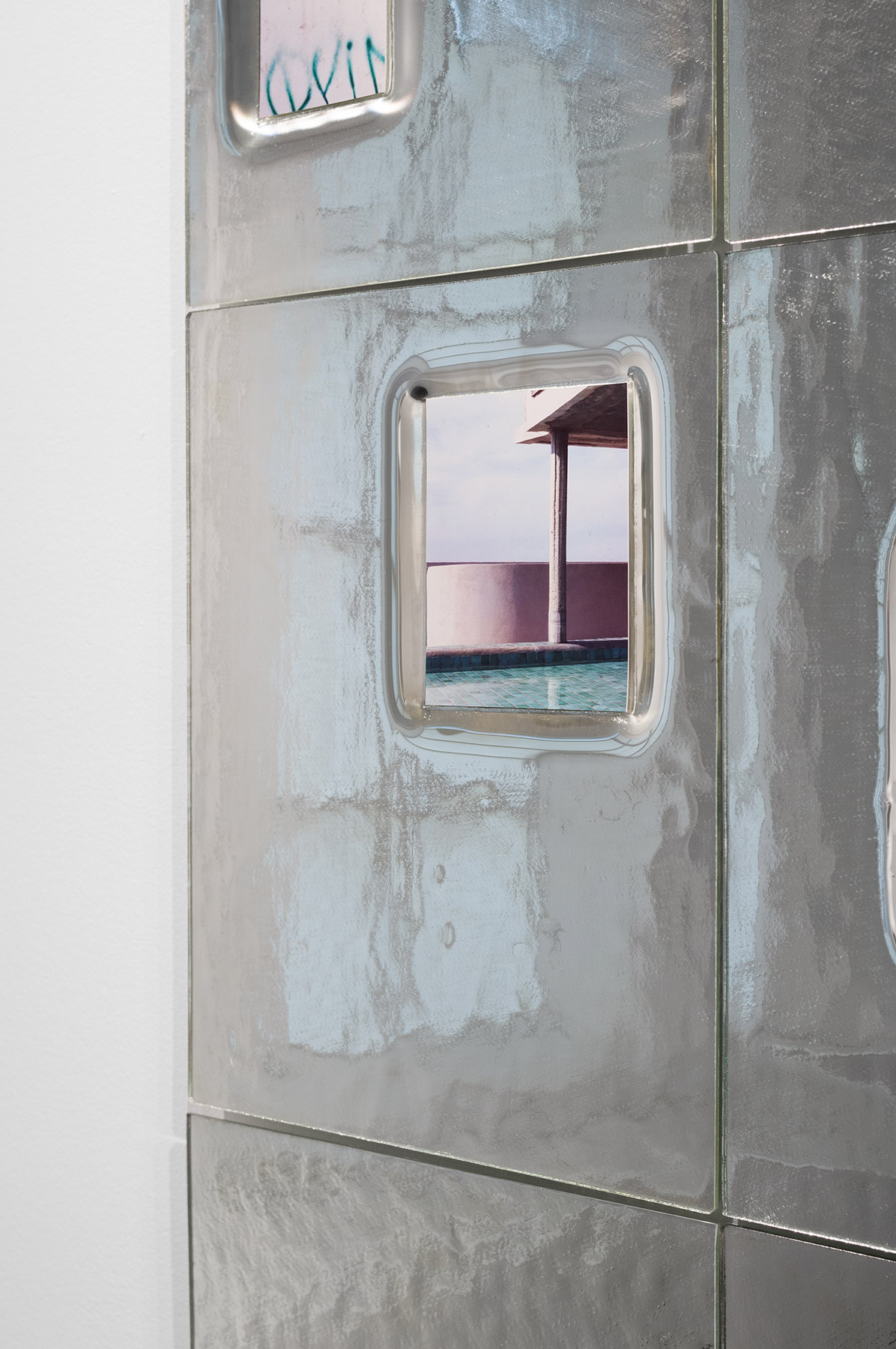Inspired by Georges Perec's book An Attempt at Exhausting a Place in Paris, which brings together a collection of observations describing all the little things in life that usually go unnoticed, the photographic series An Attempt at Exhausting a Place reveals what at first glance seemed unworthy of attention. Lorna Bauer draws on her personal archive to revisit images taken over the last twenty years, highlighting the mundane details, ordinary events, and subtle phenomena that cause the world around us to fluctuate. The photographs are inserted into glass tiles shaped by the artist, onto which she has carefully applied silver nitrate—a chemical substance that reveals the photographic image. Between image and object, each work presents itself as a fragment of an infinite whole, cataloguing the minute variations of time, light, setting, and life. Reflections of the surrounding reality combine with the shimmering effect of silver nitrate and photographs from the artist's archives to create complex, prismatic representations of life.