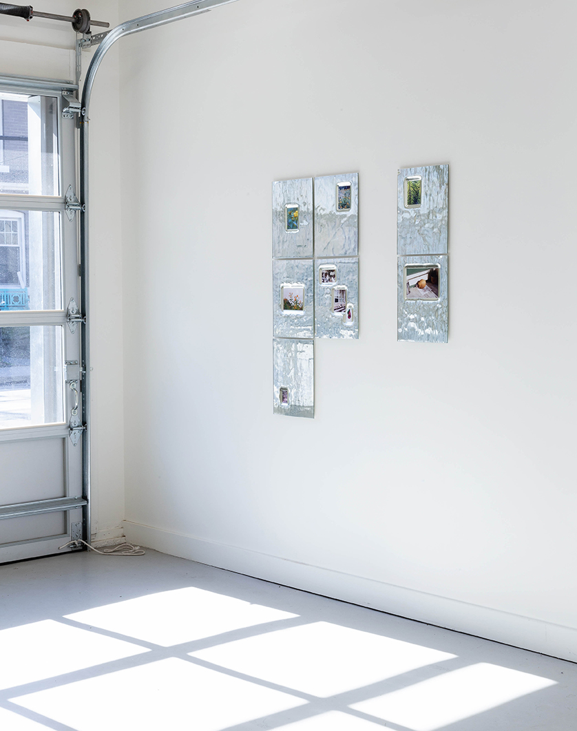 The exhibition Sunday is Violet loosely connects three photographic ensembles that together manifest Bauer’s rigorous and fervent love for the processual. White roses softly cascading against a veil of chemicals, are made apparent by using expired black-and-white polaroid film. A bee is captured swooning in the corolla of a delicate Japanese anemone, barely trembled by the wind during long exposures. Alongside these are pocket-size snapshots inlaid into dazzling hand-mirrored glass panels. These are delightful, mundane visions encountered in gardens—familiar sites in Bauer’s work—although they could have been shot anywhere, far or near. What matters here is the embodied act and labour of crafting an image.
